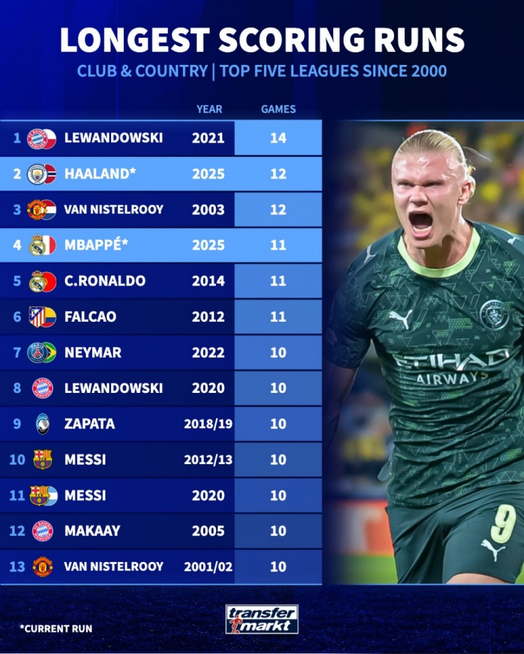 2025-10-23 00:08:05新世纪五大联赛球员最长连续进球榜:莱万14场 哈兰德范尼均12场