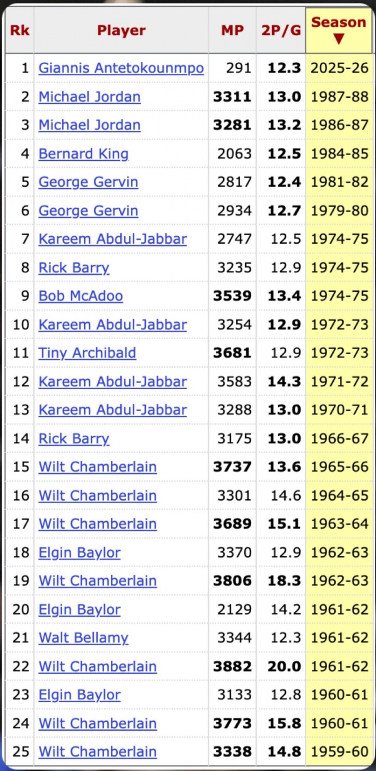 2025-11-11 16:17:47字母哥赛季场均12.3个两分球 历史上25次出现 19次在引入三分线前