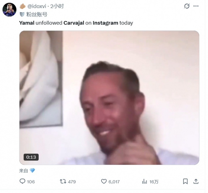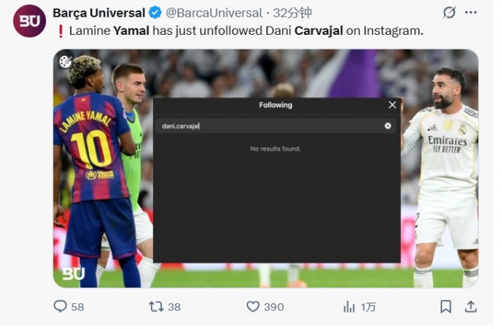 10月27日讯 今天西班牙国家德比之后,有不少球迷发文表示亚马尔取关了卡瓦哈尔,经查证目前两人确实未互相关注,但是否是因为今天两人的冲突取消关注还有待确认。