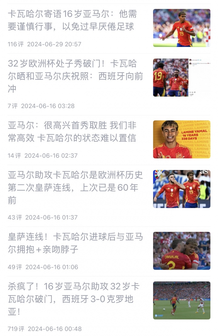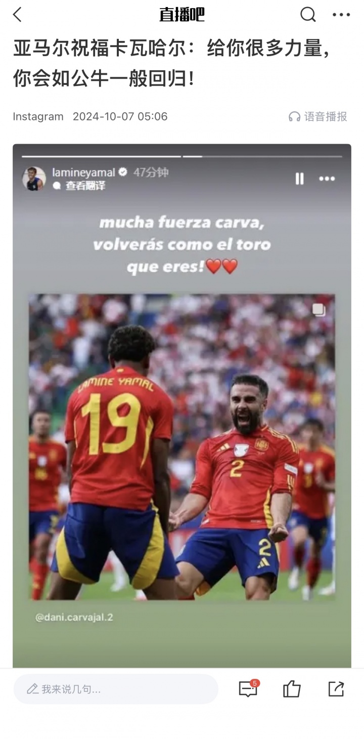 不过此前有报道称,2024年欧洲杯之后,亚马尔关注了卡瓦哈尔。2024年欧洲杯亚马尔和卡瓦哈尔有很多互动,卡瓦哈尔多次鼓励亚马尔,后者在前者遭遇重伤的时候也通过社媒送上祝福。